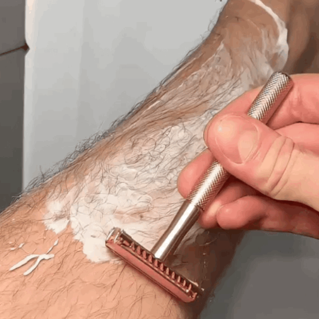 Pidä höylää noin 30 asteen kulmassa ihoa vasten ja käytä lyhyitä, kevyitä vetoja – ilman painetta. Anna höylän oman painon hoitaa työ. Ei tarvitse painaa kuten muovihöylällä. Mene rauhassa, varsinkin alussa, ja aja aina kostealle, pehmennetylle iholle (esim. öljyn tai geelin kanssa).
